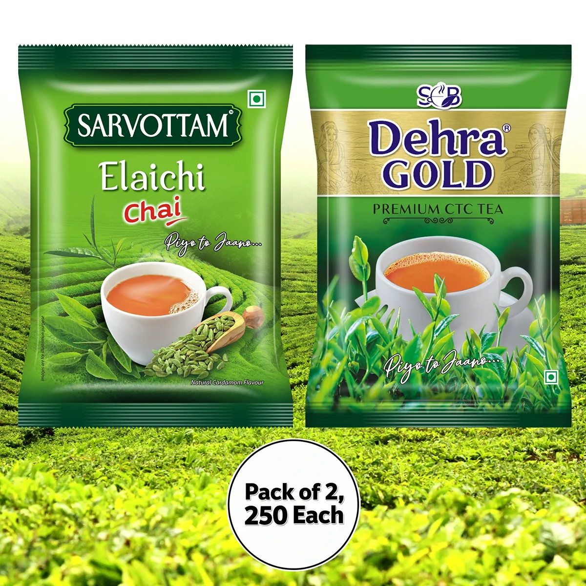 Sarvottam Dehra Gold Premium CTC & Elaichi, Premium Cardamom Flavoured Combo Tea Pack, 500g (Pack of 2, 250g each)