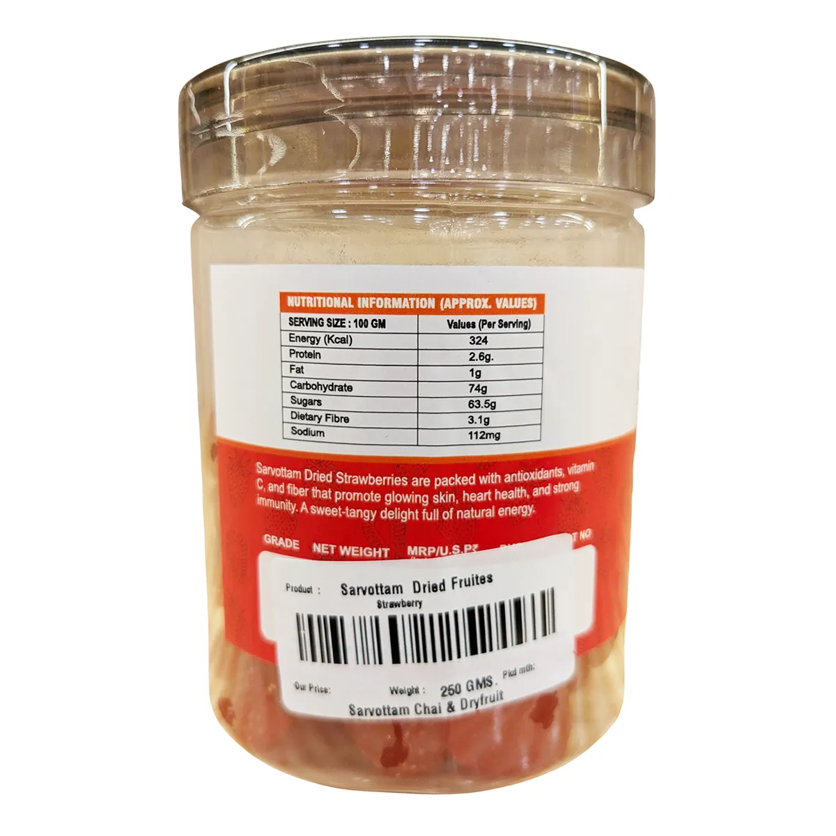 Sarvottam Dried Strawberries – Naturally sweet & tangy dried strawberries, rich in fiber, antioxidants & vitamins for a healthy tasty snack.